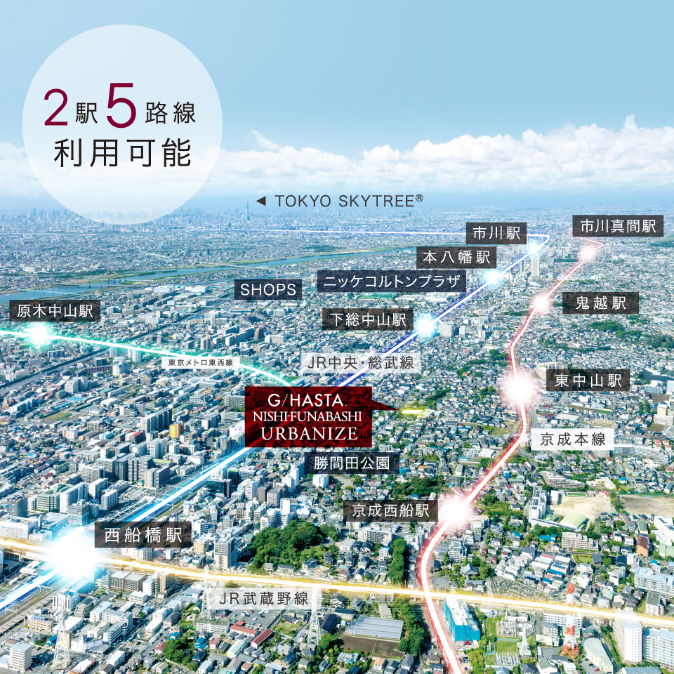 毎日の暮らしに便利な西船橋エリアの商業施設や緑豊かな公園はもちろん、近隣のニッケコルトンプラザやイオンモール船橋といった、休日に家族で楽しめる大型ショッピング施設も身近に位置しています。