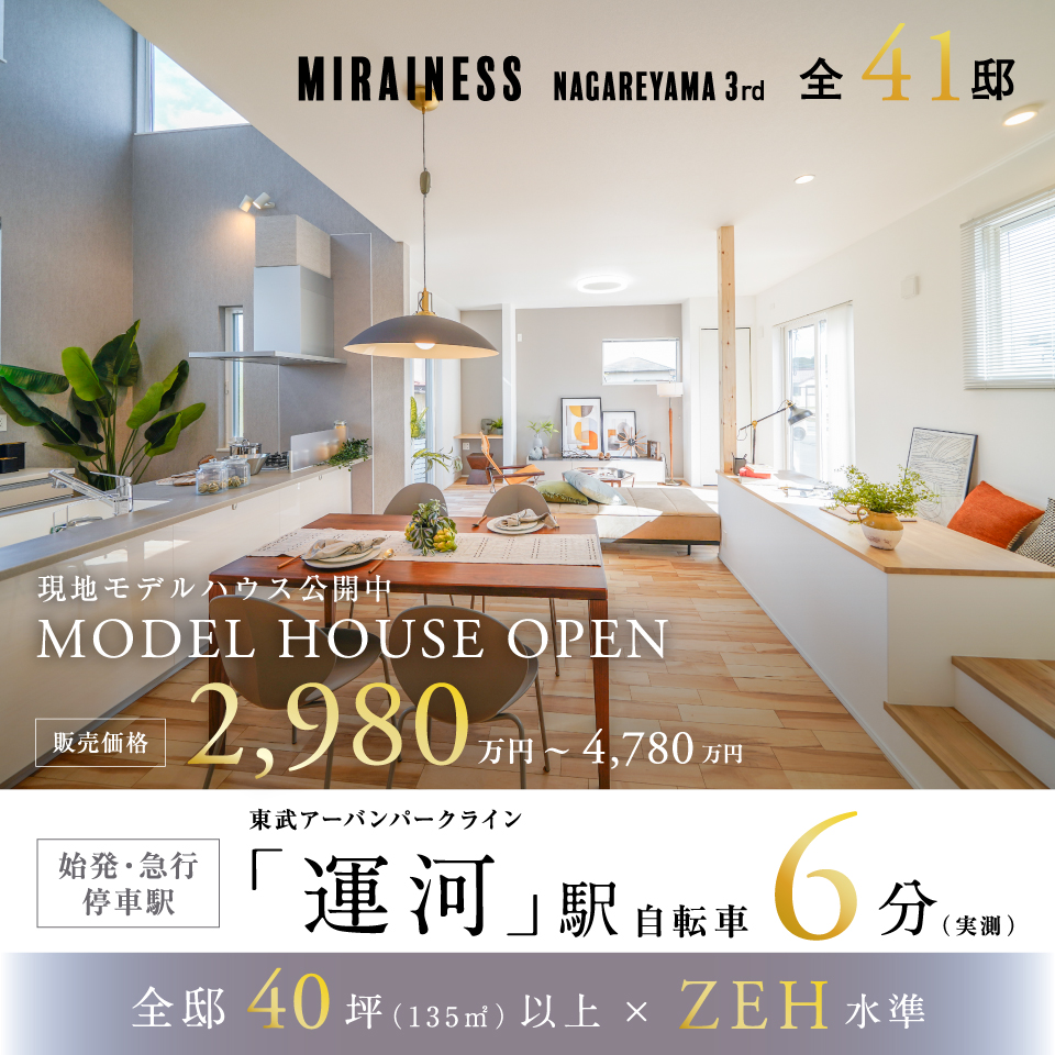 現地モデルハウス完成/見学予約受付中流山市に誕生する全41邸の「ミライネス流山 3rd」森と暮らす街・流山市から始まる41家族の新たなる生活が誕生します。水と緑が彩る健やかさと、潤いに満ちた街運河。人生100年時代を健やかに暮らす為に、様々な工夫を施した住まいが誕生します。ゆとりある敷地面積を活かした緑豊かな植栽。街区内公園では子供達が自然と集い、分譲地内道路では、住人同士の交流の場となり自然とコミュニティが広がっていきます。《アクセス》◆「運河」駅自転車6分※実測◆「流山おおたかの森」駅電車7分※急行1駅5分。◆「柏I・C」まで車5分※実測◆「利根運河」徒歩3分《建物》◆2030年レベルのZEH水準を備えた住まい提案◆全邸敷地面積40坪以上(135㎡)に駐車場2台標準設定◆ウルトラファインバブルを全邸標準採用◆「電気×ガス」のハイブリットのECO ONE X5を全邸標準採用★1分で簡単入力★資料請求受付中>>>CLICK