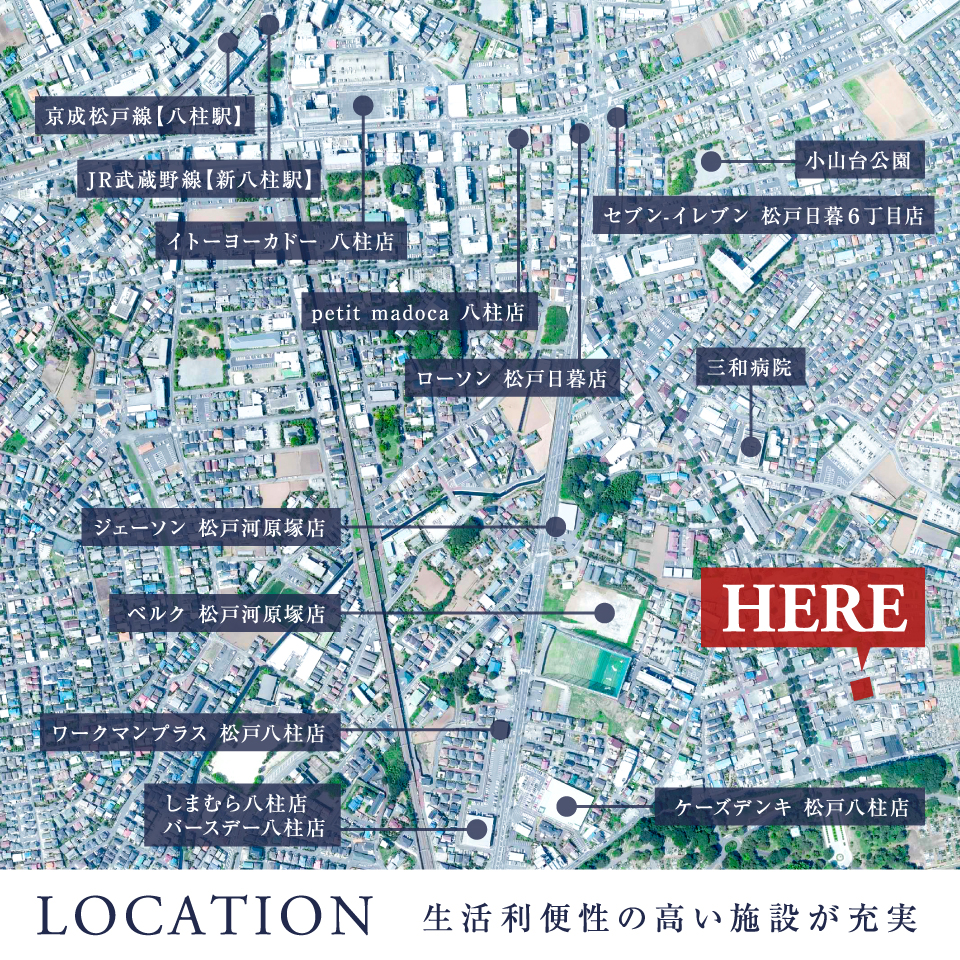 資料請求/見学予約受付中■JR武蔵野線・北総線「東松戸」駅自転車8分(実測)■JR武蔵野線「新八柱」駅徒歩18分■京成松戸線「八柱」駅徒歩18分■松戸市の充実した子育て環境を享受した暮らし■徒歩圏内に生活利便施設が充実のロケーション【近隣モデルハウス公開中】日程:12/27(土).28(日).1/4(日).10(土).11(日).12(月祝)時間:(1)10:30~(2)13:30~(3)15:30~