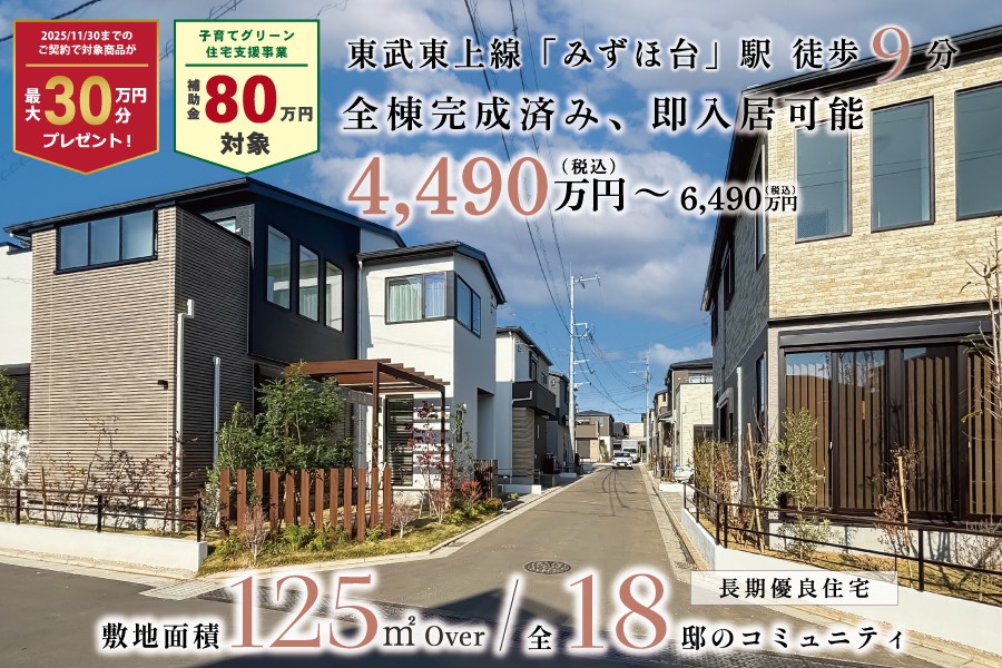 東武東上線「みずほ台」駅徒歩9分・全18邸の大型プロジェクト始動。全邸敷地面積125㎡以上、カースペース2台のゆとり。『モデルハウス』見学予約受付中!