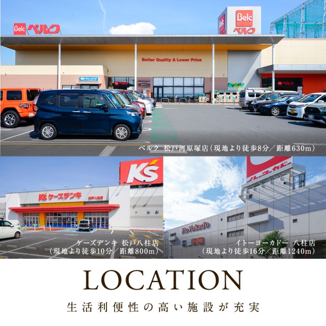 ■JR常磐線・武蔵野線「新松戸」駅自転車9分※実測・JR常磐線「馬橋」駅自転車7分※実測。